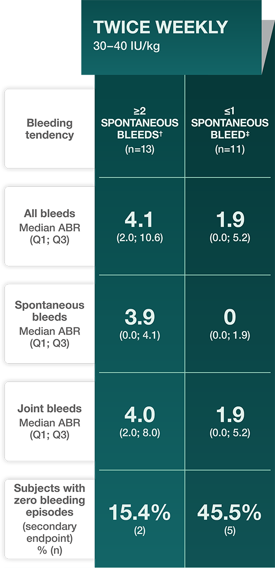 ‡ Patients with ≤1 spontaneous bleed (defined as joint or muscle bleeds and no identified trauma) during the first 10 weeks of the trial.